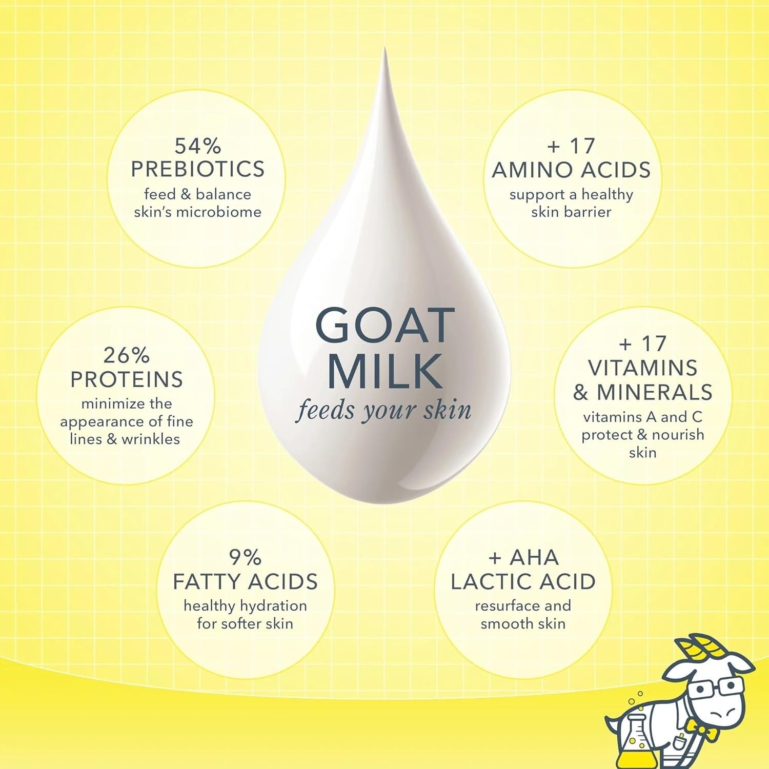 - THE GOAT MILK DIFFERENCE - Rich in lactic acid (a natural exfoliant), vitamins & minerals, goat milk has the same pH as human skin! It helps keep the microbiome well-balanced and prevents visible signs of irritation, sensitivity & premature aging.