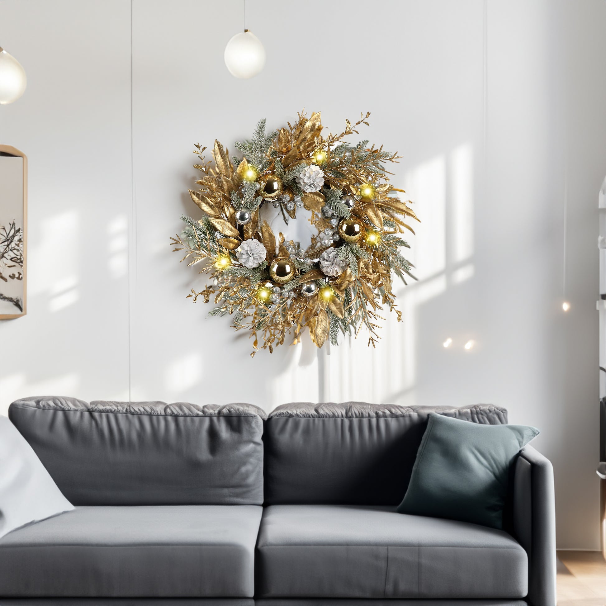 Bring festive charm to your home with our 20-inch Christmas Wreath, beautifully designed with pine needles, pine cones, Christmas balls, golden twigs, and silver berries for a natural and lifelike holiday look. Featuring a string of 20 warm LED lights with 8 lighting modes and a built-in timer, this wreath creates a cozy and welcoming glow for your holiday celebrations. Perfect for doors, walls, windows, fireplaces, or staircases, it instantly adds warmth and a festive atmosphere to any space. Pre-assembled and easy to hang, this wreath is both practical and elegant, making it the perfect holiday decoration for your home.